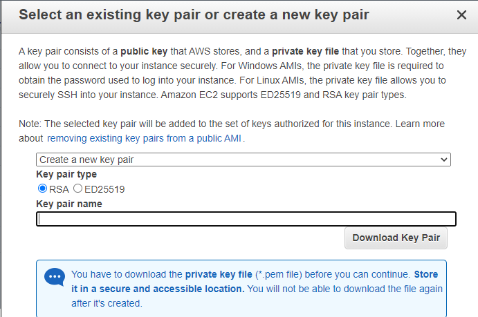 The content of the file is RSA encrypted, which uniquely determines your access to the instance. Click on create new, give it a name(that you must remember), and download it.