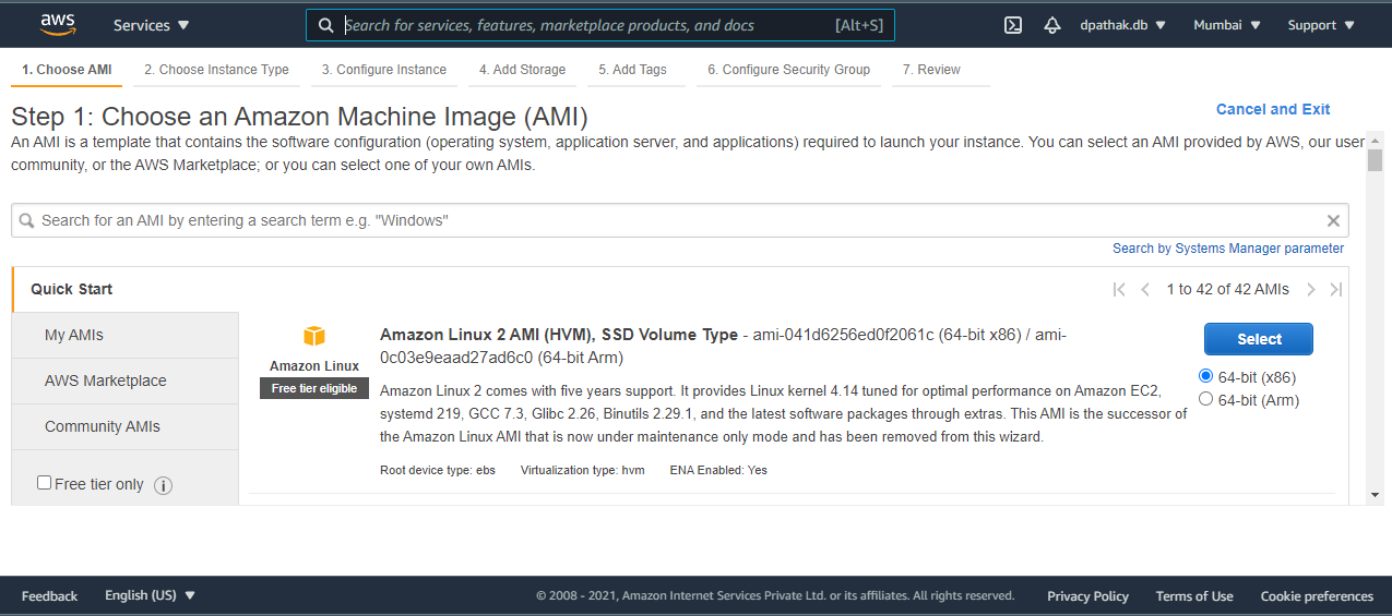Click on the blue ‘Launch a virtual machine’ line, and you’ll be taken to the EC2 setup screen, wherein you’d have to select an AMI, an Amazon Machine Image.