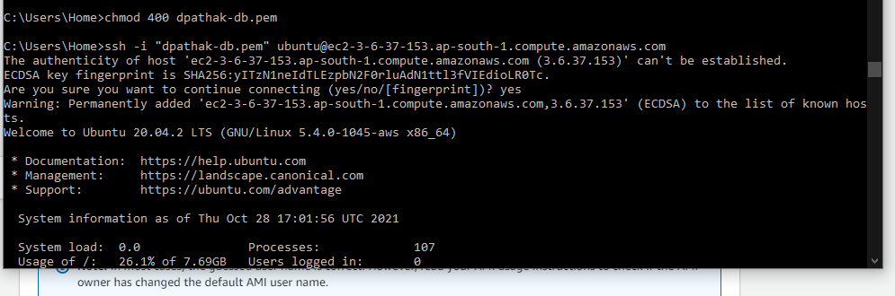 It’ll ask a confirmation prompt that you have to type yes to, and if all works well, you should see a welcome to Ubuntu text as shown above, which means that you’re now logged into the instance.