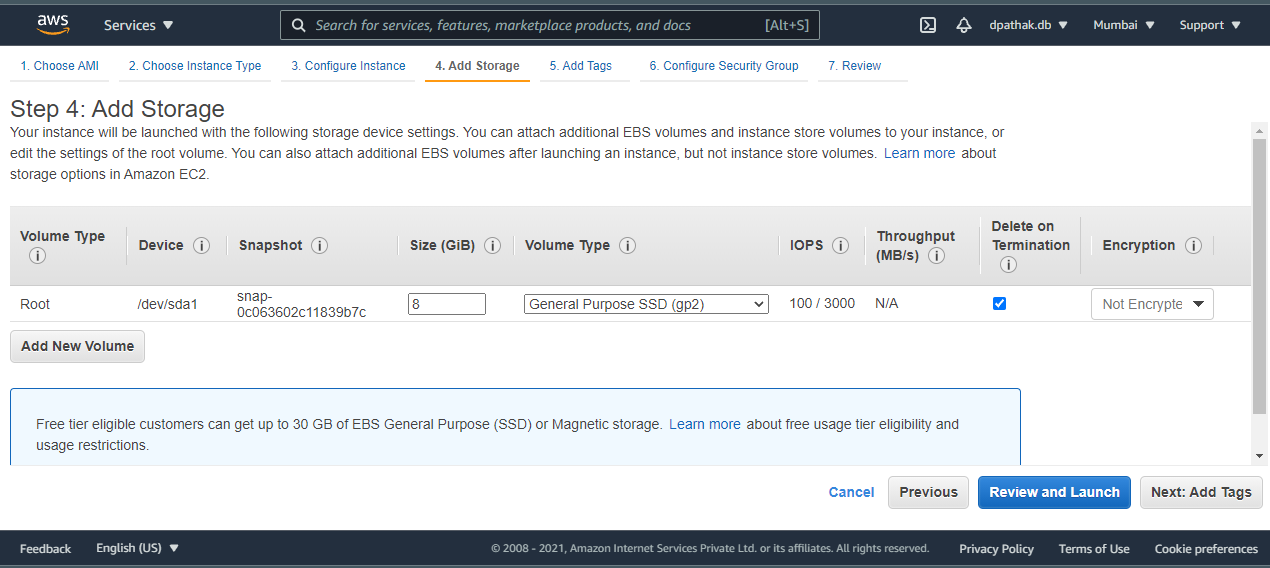 As the name suggests, storage refers to the amount of storage in our server. Note that this isn’t the storage you’d consider for storing databases. This is temporary storage that will last only as long as the instance lasts, and thus, can be used for things like caching. A size of 8GB, that’s part of the free tier, and is the default, suffices our purpose.