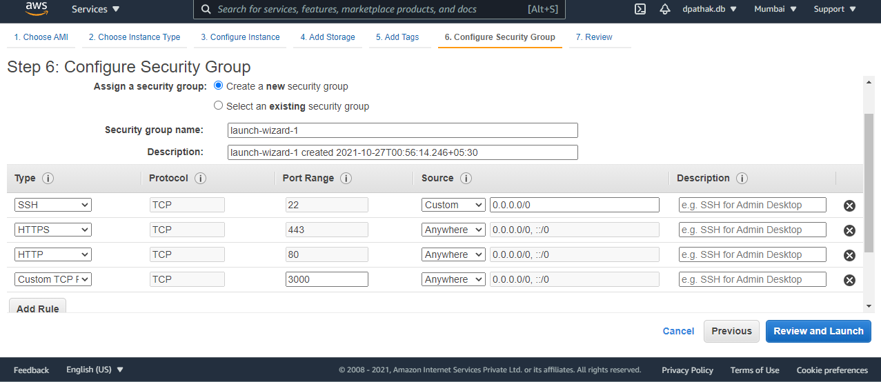 For simplicity, we’ll keep the sources of all of those at ‘anywhere’. Ideally, SSH should be limited only to those you want to allow to connect to your instance, but for the sake of the tutorial, we’ll keep it at anywhere.