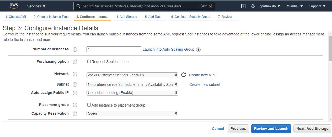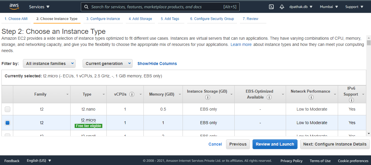 Here, we’ll pick the t2.micro instance types, which is the only one available in the free tier. You’ll need larger ones as your application size and requirements in RAM or processing speed increase. In case you’re not clear with any of the column fields, click the information icon next to the headings to get a description of what it means.