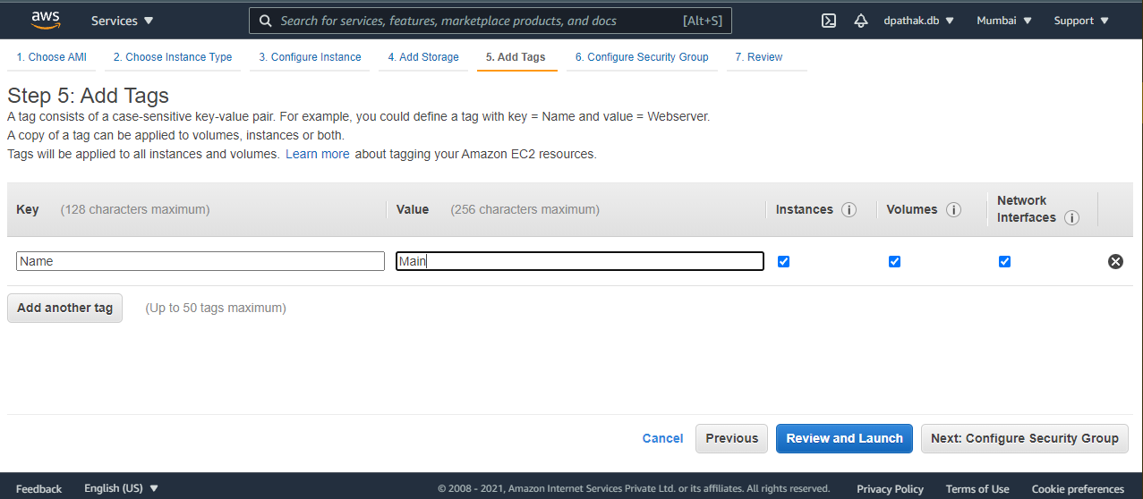 Next, we’d be adding a tag for our instance. It is a key:value pair that describes an instance. Since we only have a single instance right now, it is not very useful, but when you are working with multiple instances and instance volumes, as will be the case when the application scales, it is used to group, sort and manage these instances.