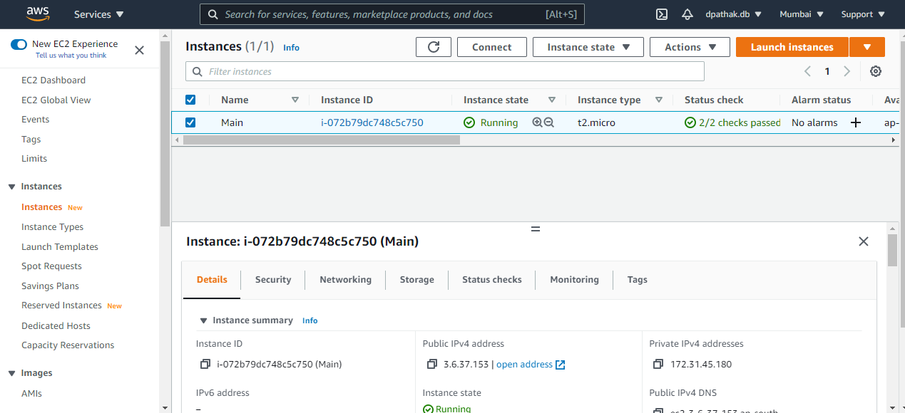 Once the file is downloaded, you’ll get a prompt that your instance is starting, and after a few minutes, your instance will be started. Your EC2 home page should look like this. Note the Name : Main(tag), the Instance type t2.micro that we selected when we were setting up the instance.